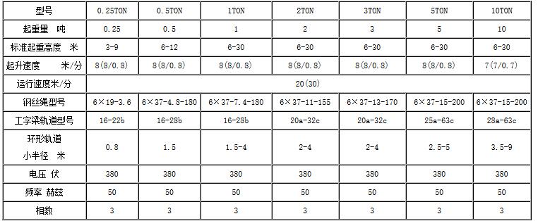 每種規(guī)格鋼絲繩電動(dòng)葫蘆所對(duì)應(yīng)的工字鋼軌道范圍如下圖: