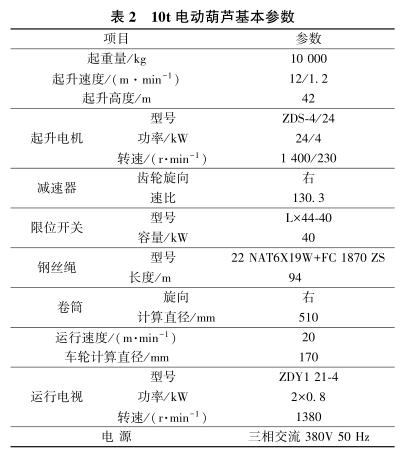 移動式電動葫蘆吊物系統(tǒng)主要由5,10t 電動葫蘆、電動葫蘆運行軌道及電氣控制系統(tǒng)組成。 在結(jié)構(gòu)邊跨設(shè)吊物孔,吊物孔處1,2 層及地下室各層梁板結(jié)構(gòu)留空,在3層主體結(jié)構(gòu)梁下(高度≥8m),利用3層結(jié)構(gòu)梁板作為支承,支承梁板及洞口邊梁進(jìn)行結(jié)構(gòu)加強。移動式電動葫蘆吊物系統(tǒng)利用3層結(jié)構(gòu)梁預(yù)埋對穿螺栓、主體結(jié)構(gòu)施工時的支模架改作操作平臺及塔式起重機、手動葫蘆等工具配合完成安裝,經(jīng)荷載試驗及驗收合格后方可使用。5,10t電動葫蘆基本性能參數(shù)分別如表1,2 所示。